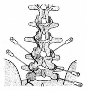 El más común nervio bloqueado de la articulación facetaria es la rama medial . Como se demuestra en la figura 6.4 el nervio se bloquea traspasando la aguja dentro del “ ojo del Scottie dog” Siguiendo la confirmación con rayos X, se inyecta anestésico local con corticoides (2-3 ml con 20 mg de corticoides).