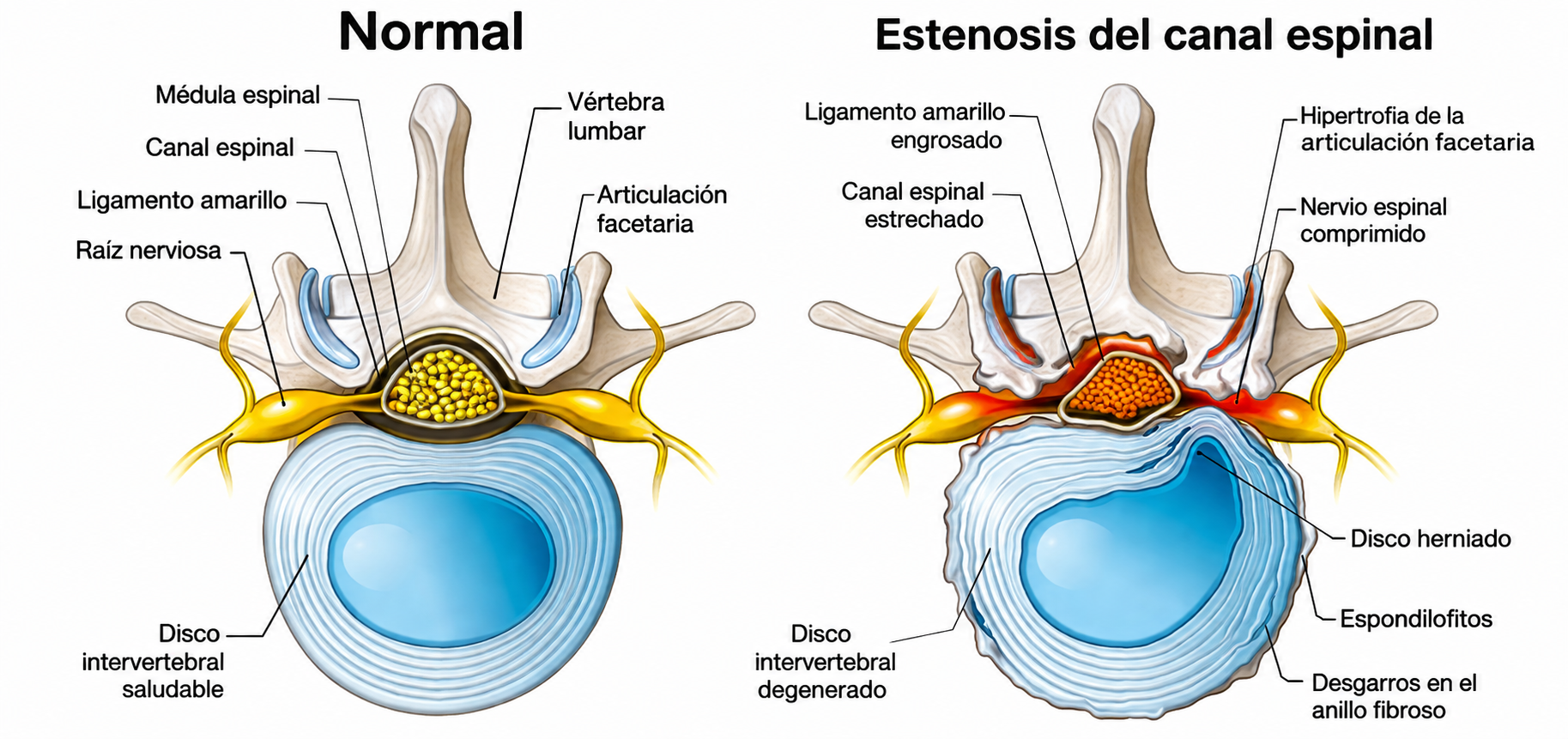 La estenosis espinal lumbar es una enfermedad degenerativa en la que el canal por donde pasan los nervios se vuelve más estrecho.
